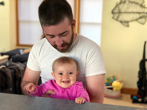 Baby on Avalon Fishing Pier in Outer BanksDad and baby smilingChicken dinner at Sandbars Raw Bar and Grill in Outer Banks, NCGrandfather holding baby girl and looking at computerBaby girl sleeping in grandmother's armsMom and baby on beach