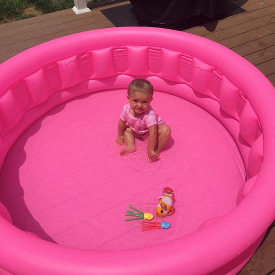 Likes Swimming in our neighbor’s pool, greeting Jimmy when he comes home from work, trying to climb on things, crawling, being in the baby carrier while I vacuum, my parents’ cat, getting a bath, being in the garden, crawling after the vacuum, being held by mom or dad, watching other kids, being outside, playing fetch with Mavis, baby gates, phones, Baby Einstein videos, our pets’ water dishes, standing, going on walks in her baby carrier, measuring cups, banging toys together, having us blow raspberries on her belly and legs, and our pets.