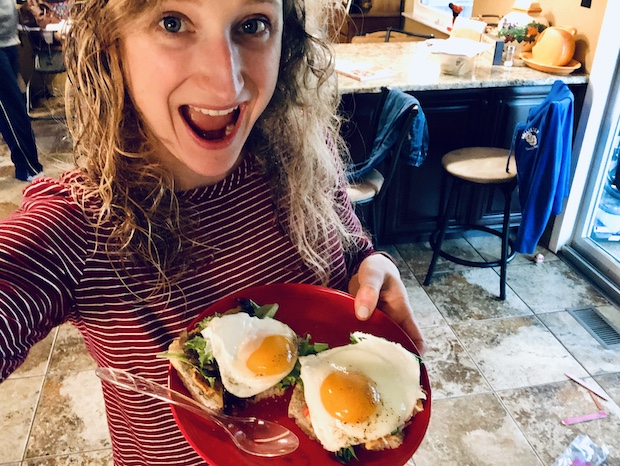 Current food Opened-faced egg sandwiches with aforementioned sourdough sandwich bread. The eggs from my aunt and uncle’s chickens. Delicious! I like to top my bread with hummus, lettuce, and parmesan cheese (and of course eggs!).