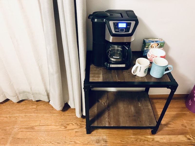 We like to have a cup of coffee first thing in the morning, but that usually gets hampered by the pets waking Sadie up and us tending to her and feeding them. So, I had the idea to make a little coffee bar in our bedroom so we could have our mugs of coffee in peace and not wake Sadie up at 5:00 am!