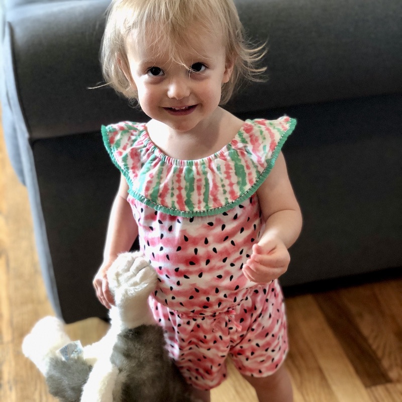 Current cuteness Sadie wearing a watermelon romper while holding her stuffed husky that was my sister’s while she was a child.