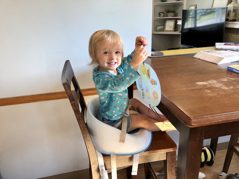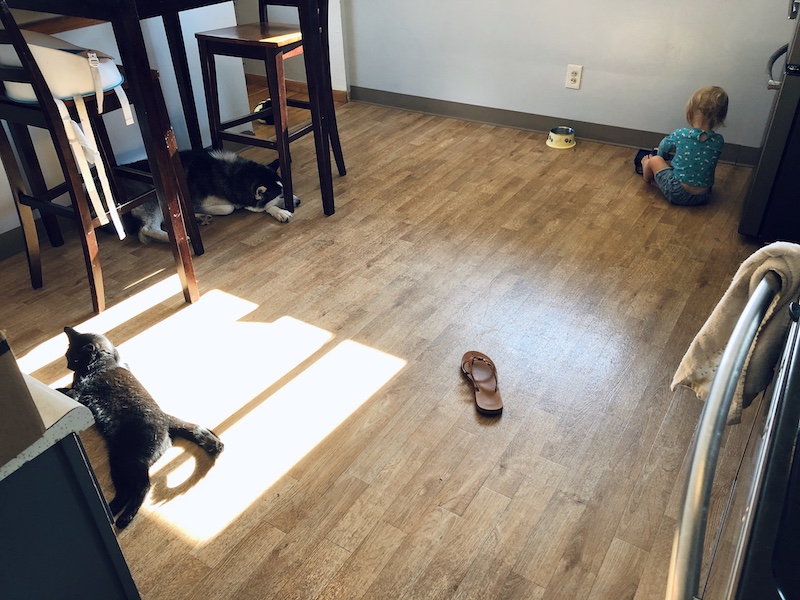 These three are happy to be reunited! Malcolm was sunbathing, Sadie was playing with her trucks, Niva was napping, and my flip flop was resting in the middle of the kitchen. All was right with the world 🙂