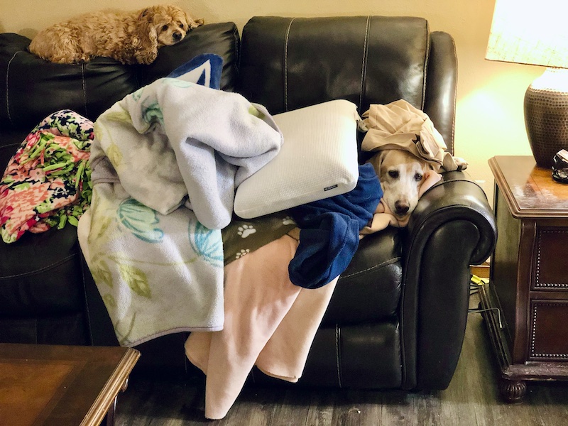 When we were at my parents’ house, Sader Tot must have thought my mom and dad’s dog was cold because she put a blanket on him. Then a few more. And a pillow and pillowcase for good measure 😉