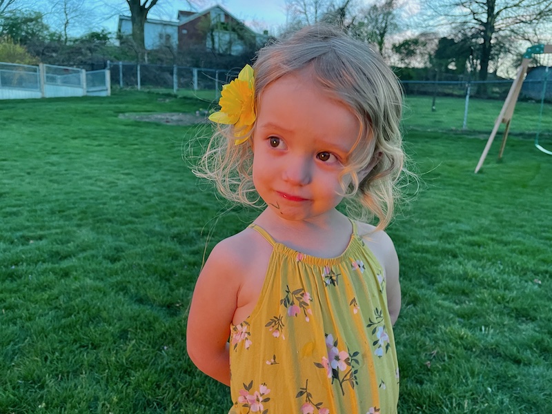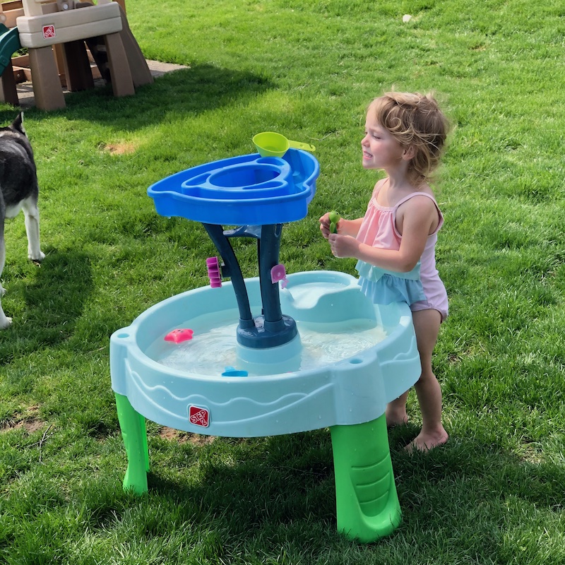 It was somehow warm enough in April to bust out her bathing suit and fill up the water table!