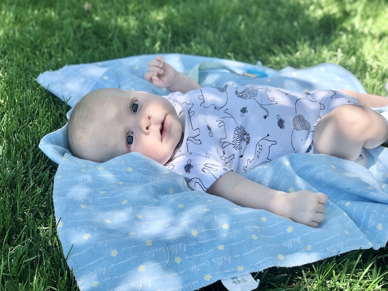 Two month old baby boy laying on a blanket in grass