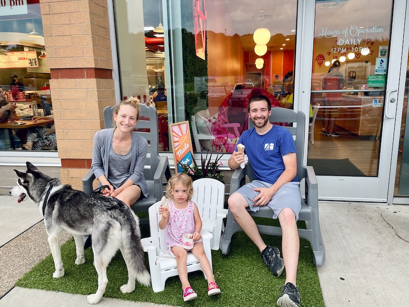Family eating ice cream with dog at Millie's ice cream in Bridgeville, PA