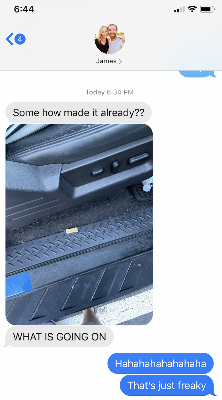 I have no idea how a dog bone ended up in his truck but it really freaked him out and was hilarious!
