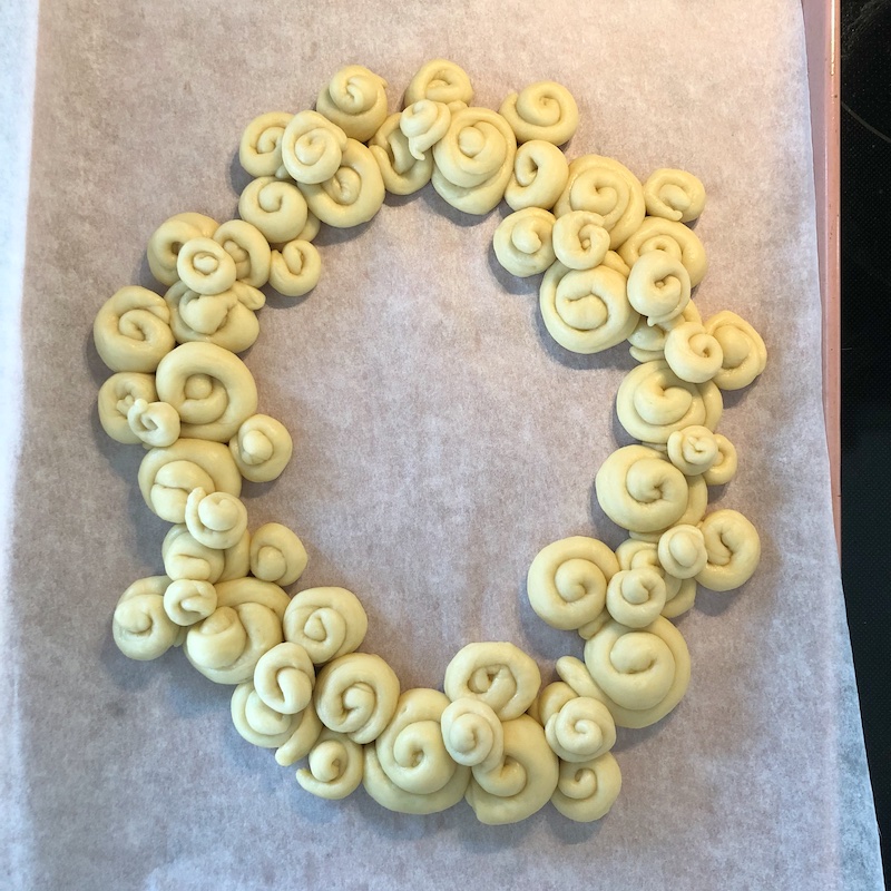 Once all of your dough swirls are placed on the cookie sheet and arranged how you want, they should look roughly like the picture below. Small swirls can even sit on top of large ones to fill in gaps and give the wreath more height and texture.