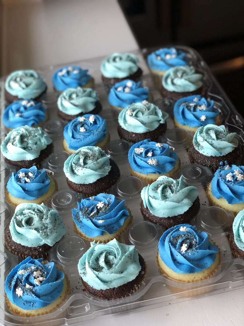 I had a fun cupcake order for an engagement celebration! I was asked to make chocolate and vanilla cupcakes with raspberry filling and buttercream icing in the colors of the couple’s future wedding. I thought they had great taste because we had blue in our wedding, too 😉