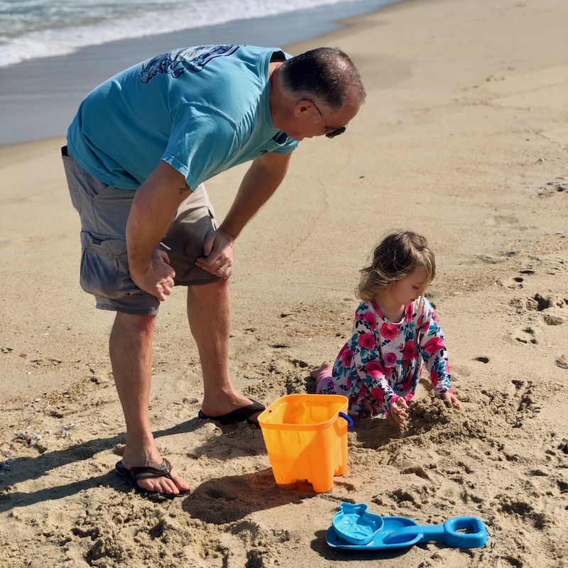 Grandpa and granddaughter playing on beach in Kill Devil Hills, NC in the Outer Banks