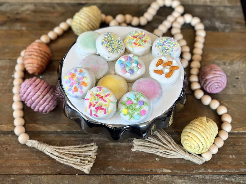 Your chocolate covered Oreos are SO springy! I love them! And I love that Sadie wanted to make sure the dog was properly accessorized. So cute!