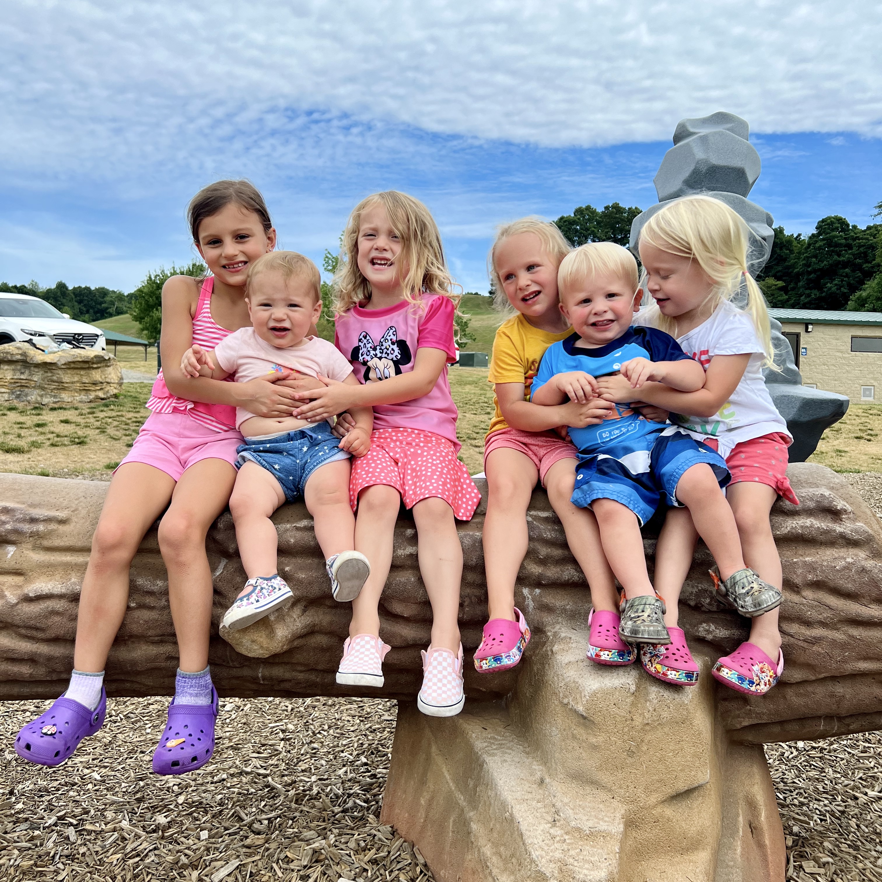 Group of kids sitting on a fake log at park in Pittsburgh, PA