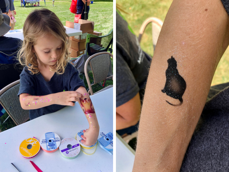 Current laugh Sadie and I got free airbrush tattoos at the aforementioned community days and our choices were interesting to say the least. Sadie went with a phoenix rising from ashes (though she says it’s a dragon) on one arm and an angel on the other. I chose a black cat because… Malcolm 🖤