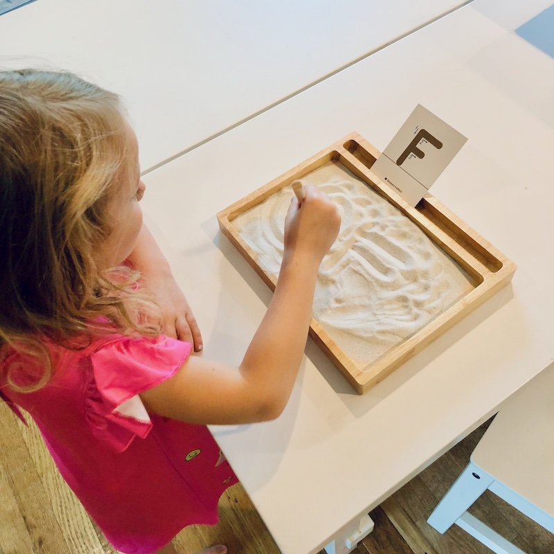 Child using Montessori sand tray to learn to write letters of the alphabet