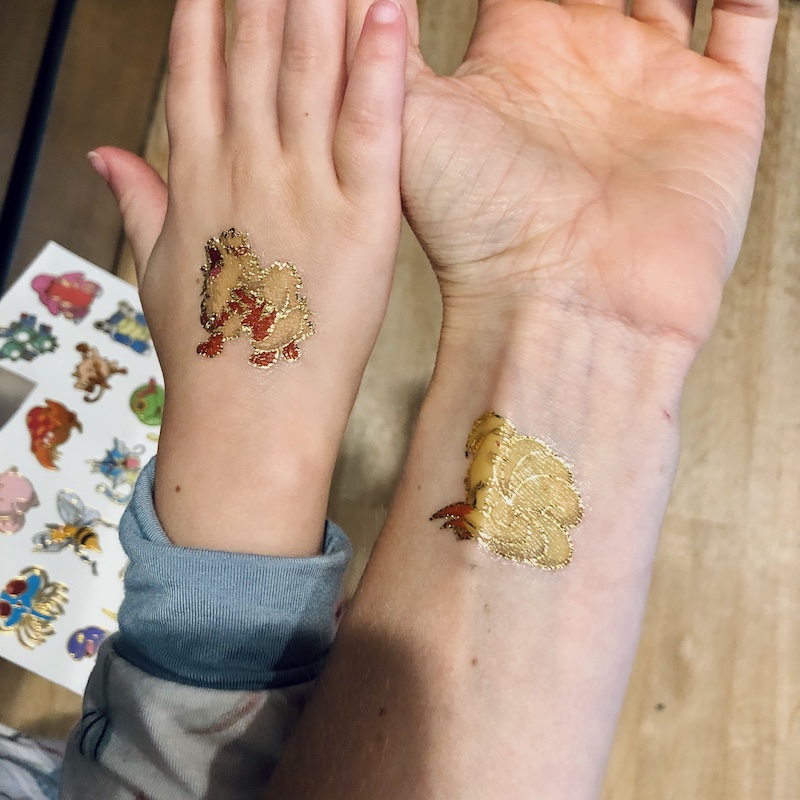 Tattoos have been pretty popular in our house lately. We got some Pokemon temporary tattoos for Sadie’s upcoming Sonic/Pokemon themed birthday party and tested them out. Even Jimmy’s dad and step mom got tattoos the other night!
