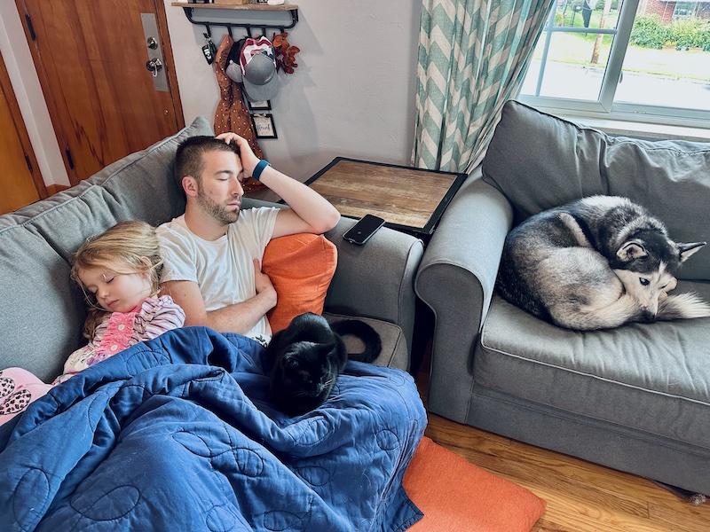 Dad and daughter sleeping on couch with pets