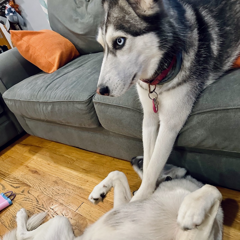 Two huskies playing with each other