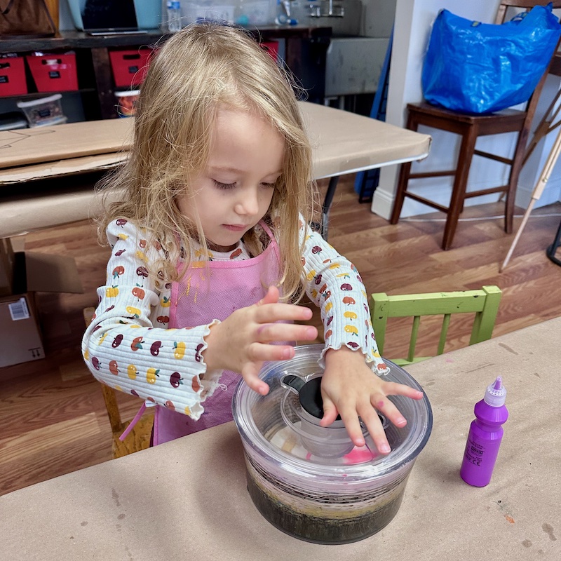 Girl using salad spinner to make spin art with paint