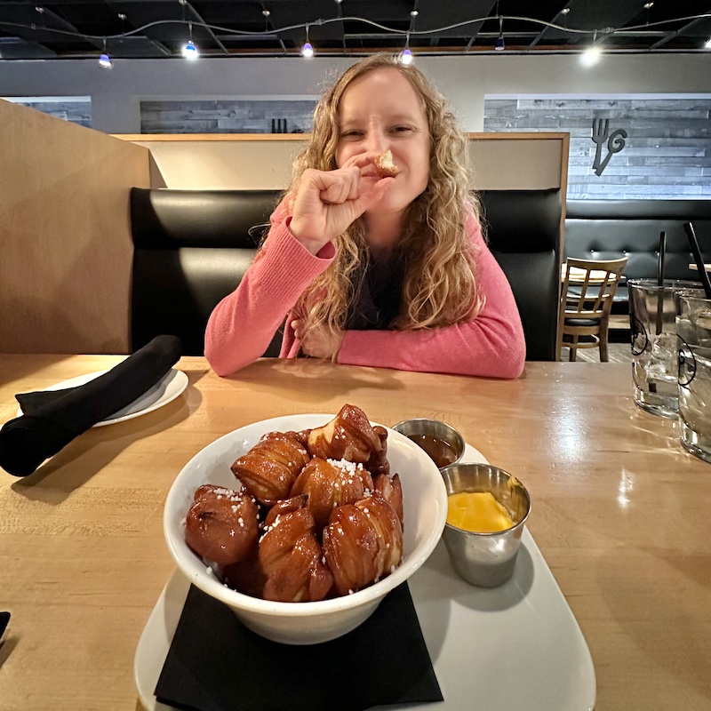 We enjoyed pretzel bites with honey mustard (my fave!), salmon, and wagyu steak. We went down a rabbit hole researching wagyu beef and it was interesting to learn about. After dinner, we headed home so Jimmy could work on baby’s nursery before Sadie got dropped off.