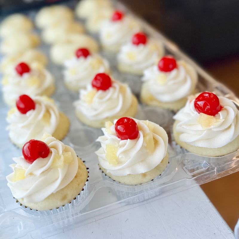 I frosted the cupcakes and decorated them with just a little bit of chopped pineapple and a maraschino cherry on top. I love the way they turned out, and of course we had to taste test them before giving them to my father-in-law. They were wonderful!