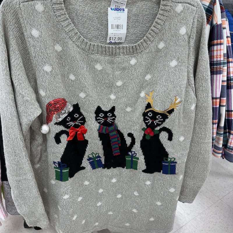 Never heard of Gabe’s before but that sweater looks like it was made for you. Christmas + cats = both of your interests combined 😂
