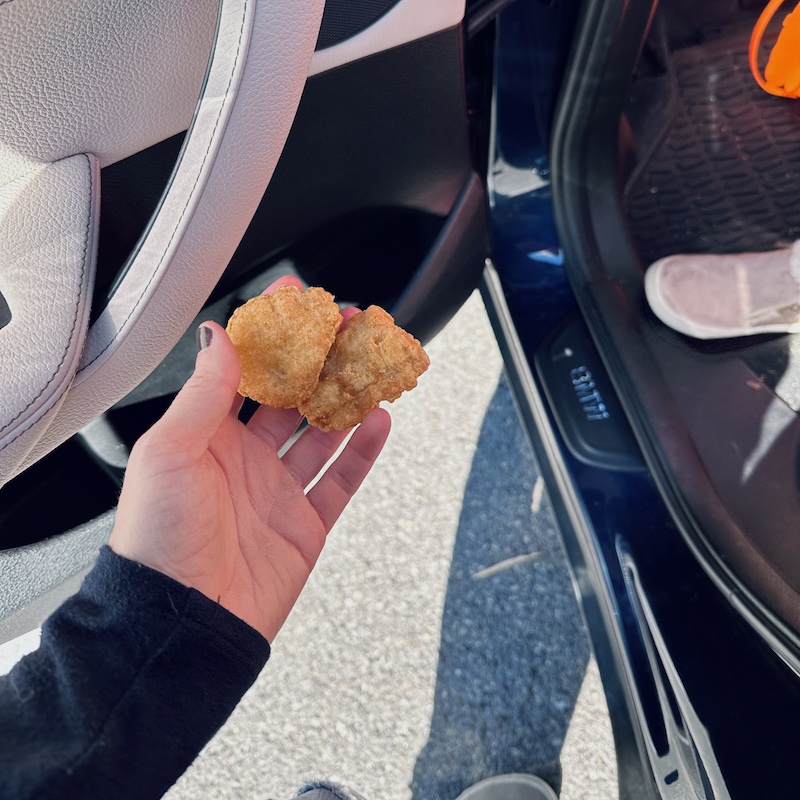 We thought they stayed in the box when they fell and I grabbed it off the floor for her. She complained of being hungry a few minutes later and we were like “You just had a four piece chicken nugget! You’re fine!” Little did we know, she only got two nuggets. Sorry, Sader Tot!!