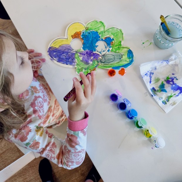 I set Sadie up with a wooden turkey mask and paint one morning this week and we both ended up making her rainbow turkey. I thought it came out pretty cute!