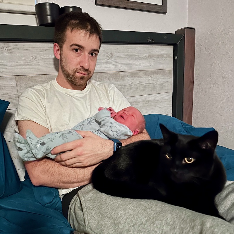 Dad holding newborn with cat on his lap