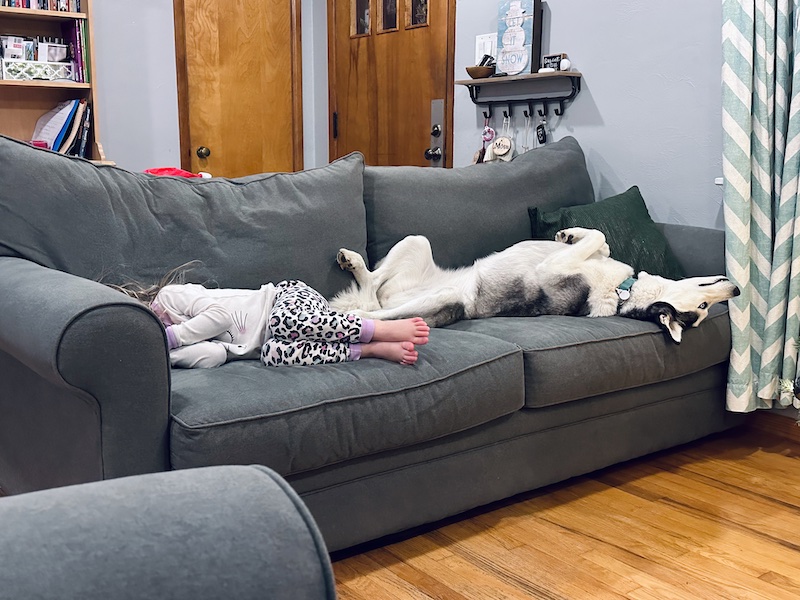 Girl and husky laying on couch