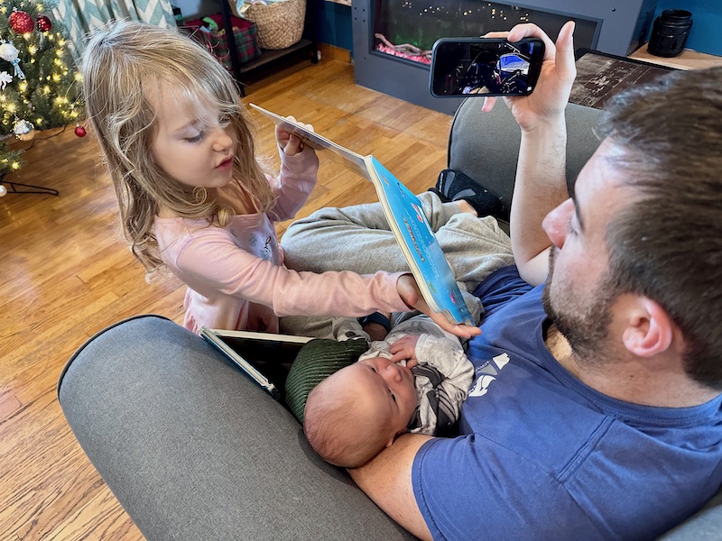 Dad with daughter and newborn son on couch