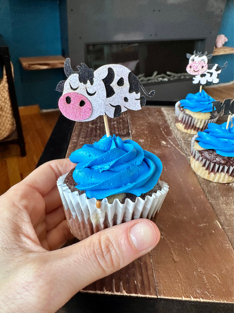 So I piped on blue frosting and topped the cupcakes with these cute cow toppers. And that’s a wrap! I can’t wait to meet their son in May 💙