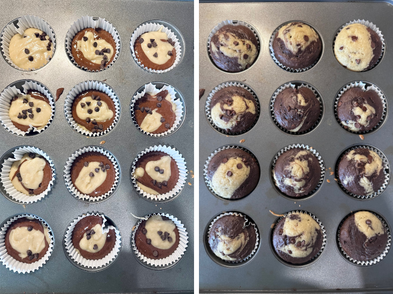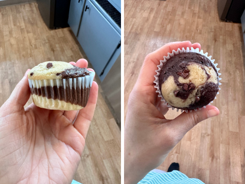 The gender reveal party was cow-themed, so I decided to make marbled cupcakes to look like a cow print pattern.