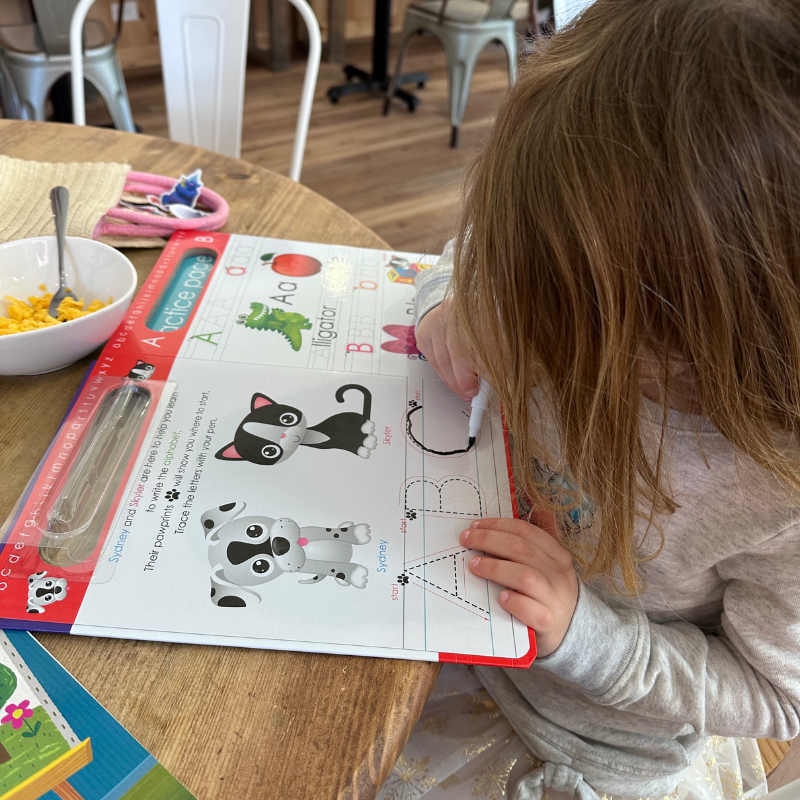 Girl writing in write and wipe bookDad doing school with four year old and baby at table in a tea shop