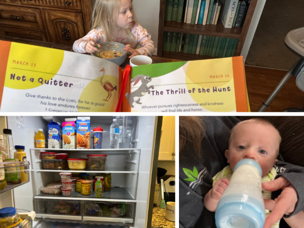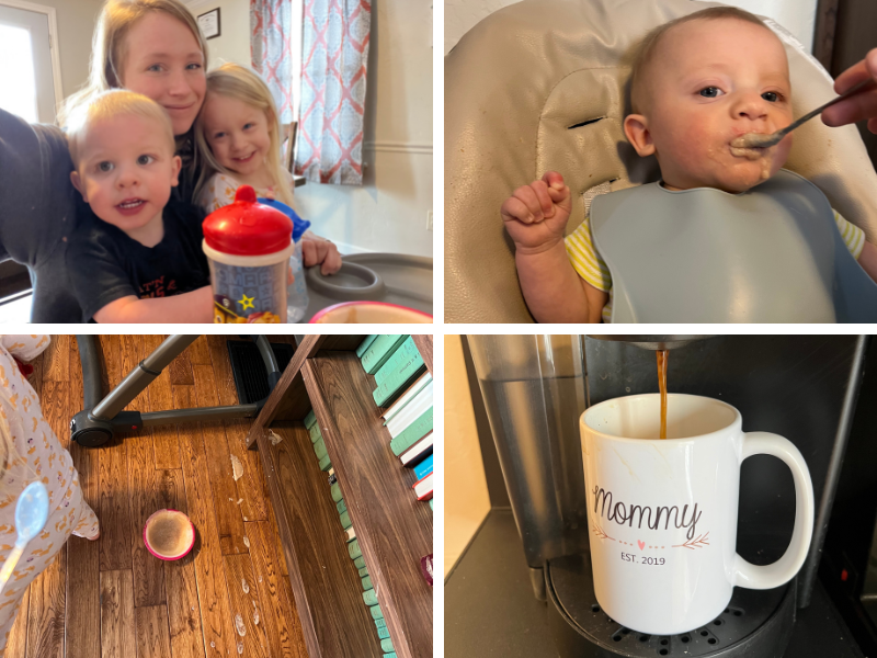 8:45 am Titus managed to throw his bowl of food… Definitely time for cup #3 of coffee! Lawson and Caroline helped make their oatmeal (they totally ate it… not 🙃).
