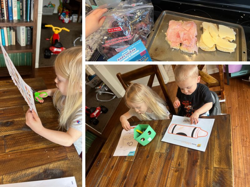 11:00 am Home! Unloaded the groceries, and I started prepping some lunch since Titus was asleep (Lawson couldn’t wait for the grapes, I guess). Lunch was cooking while we did our Bible lessons for the day! Caroline has also been working on using scissors.