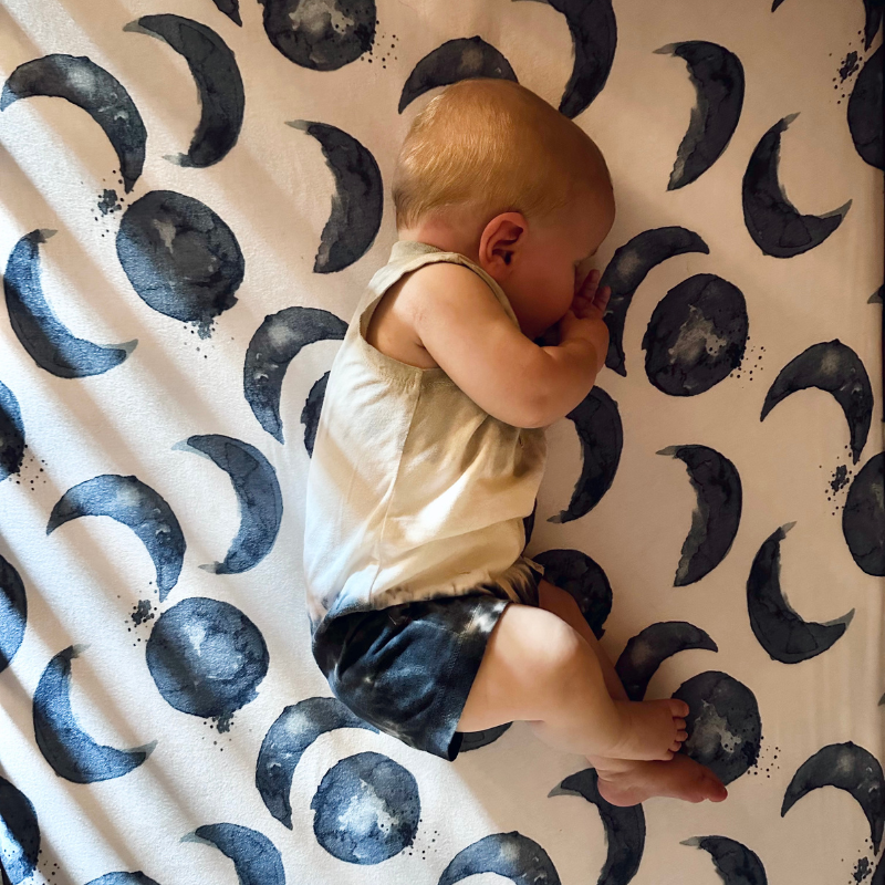 He wears a sleep sack to bed, sucks his thumb, and sleeps on his side.