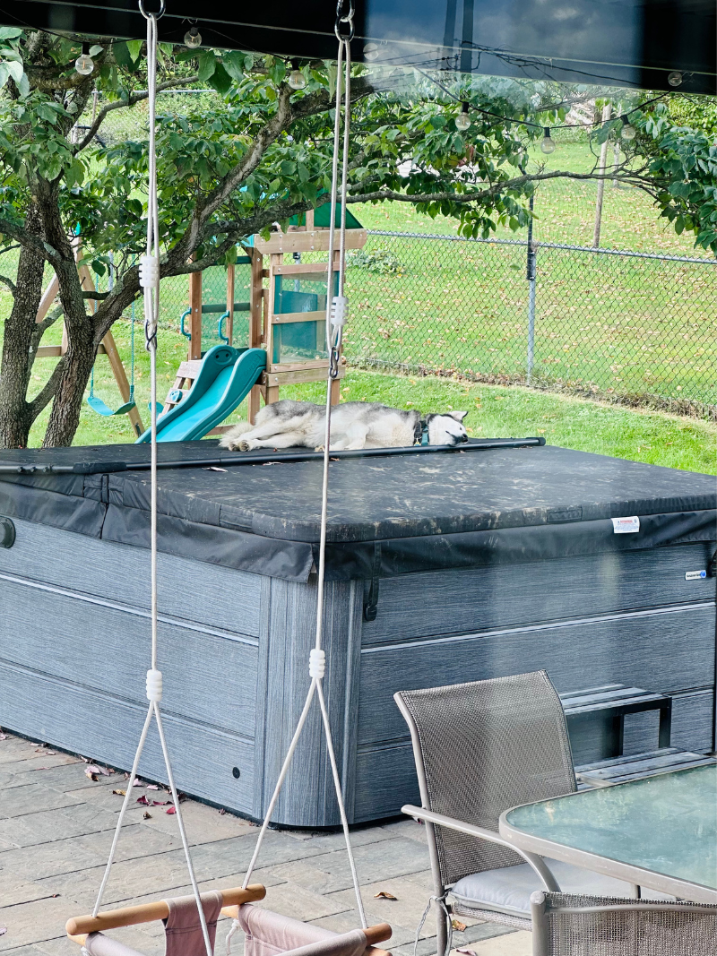 Current laugh I looked out our back door the other day and Niva was sleeping on the hot tub?!