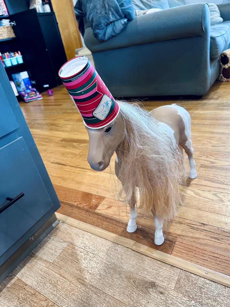 Current laugh I was in our kitchen and just happened to look over and see Sadie’s doll horse with a Starbucks cup on its head. It gave me a good laugh.