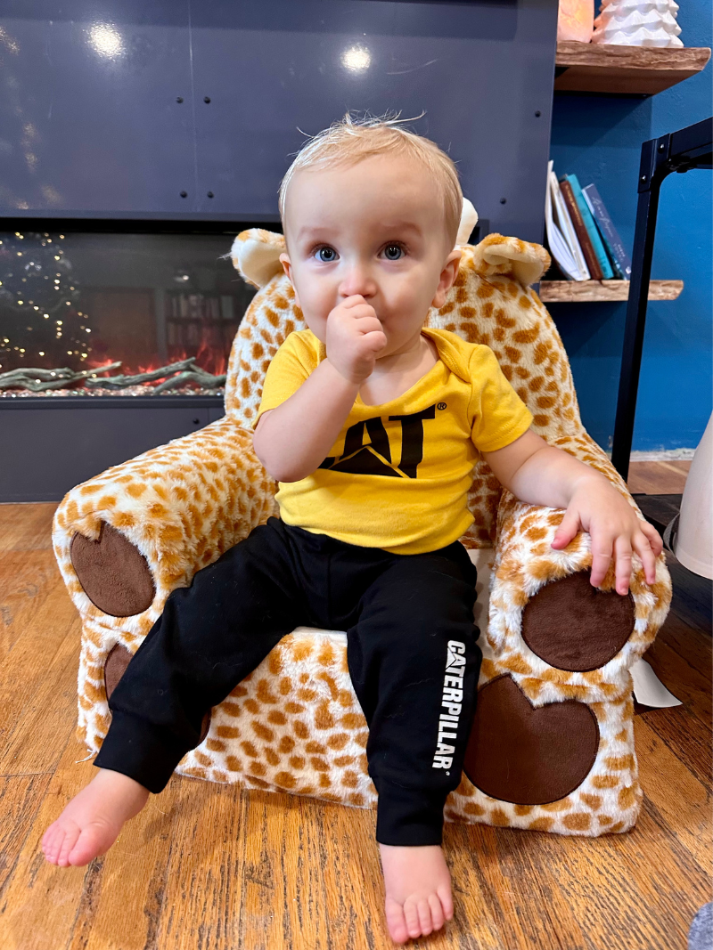 Here’s the little thumb sucker in his new outfit! He is getting close to walking on his own. He uses furniture to get around and loves pushing toys to walk.