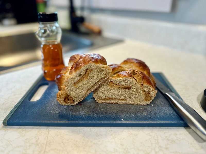 I made my classic challah dough and added cinnamon. Once it had risen, I stuffed each piece of the braid with peanut butter and honey.