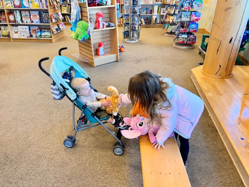Brother and sister sitting in PaneraBrother and sister playing with puppets at Barnes and Noble
