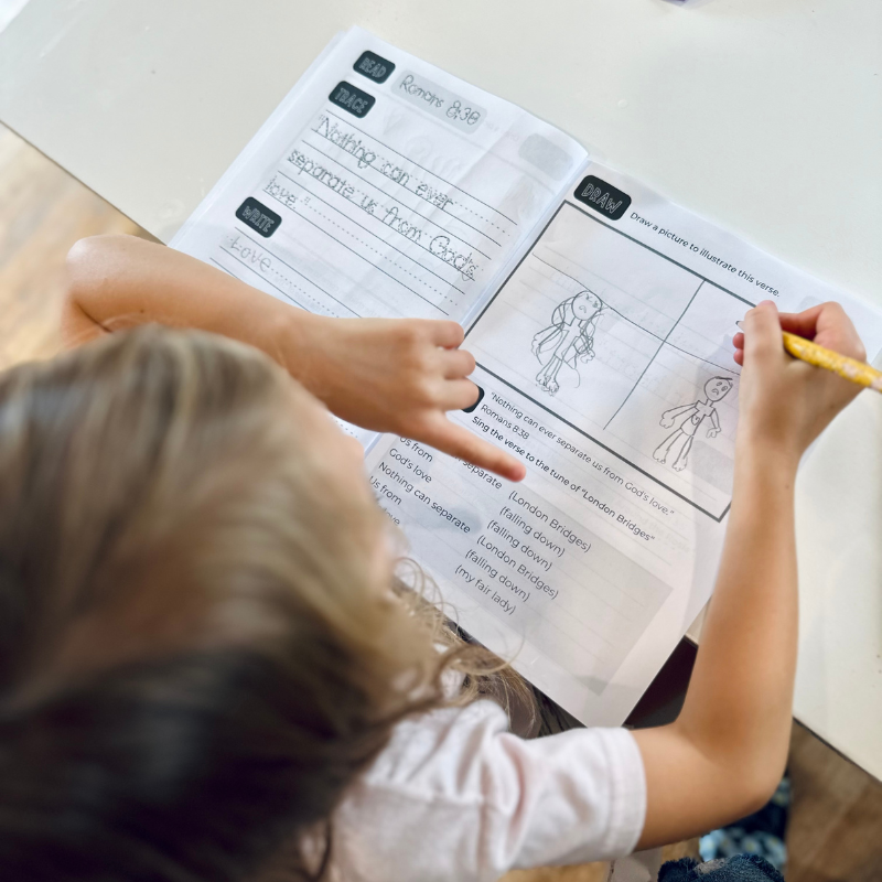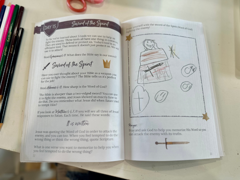 This will be our second year using Not Consumed Bible studies. We have a few workbooks on different topics and we go through a lesson each day. We read a lesson, go through the corresponding Bible verses, and then she draws a picture that goes along with the lesson.