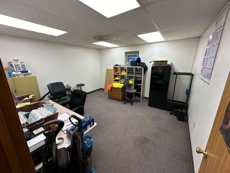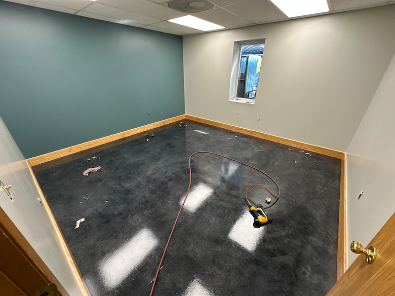 This is what we were working with! A big office space with beat up carpet, an old desk, and just an overflow of stuff. Thankfully we were able to clear it out (aside from that cubicle in the back which holds shirts they give to customers!).