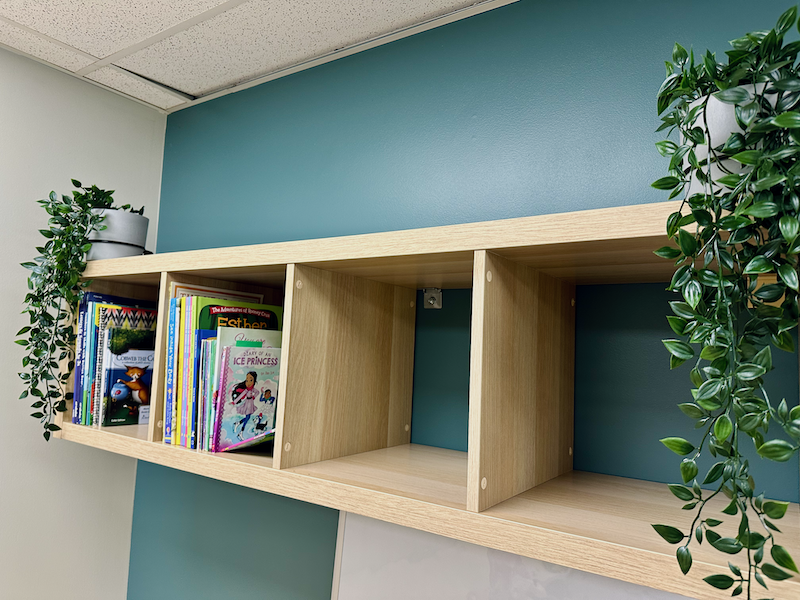 I had so much fun figuring out where to store everything and how to organize it. Honestly, the biggest consideration was making space for Mordecai to play. We stocked shelves with baskets of old toys, crayons, coloring books, and snacks and bought that blue play mat for him to romp around. Basically: it’s hard to teach older kids with little ones around unless they’re occupied 😜