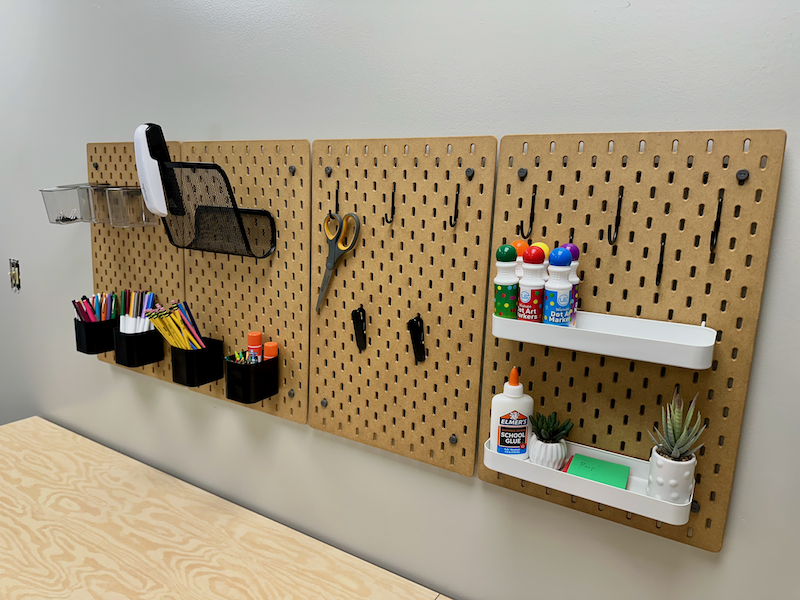 The desk, rug, pegboard above it, pegboard accessories, shelf, play mat, and plants are from IKEA! We have an IKEA pretty close to our house and just love how afforadable it is. We even found those desk drawers in a color that almost perfectly matched the accent wall paint color.