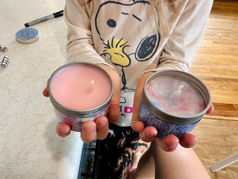 It had been quite some time since I last made a candle (I miss that hobby!), and I really enjoyed doing it with Sadie. She loved choosing her own scent combination (she used every scent oil included in the package, lol!), adding color to her candle, and decorating the outside.
