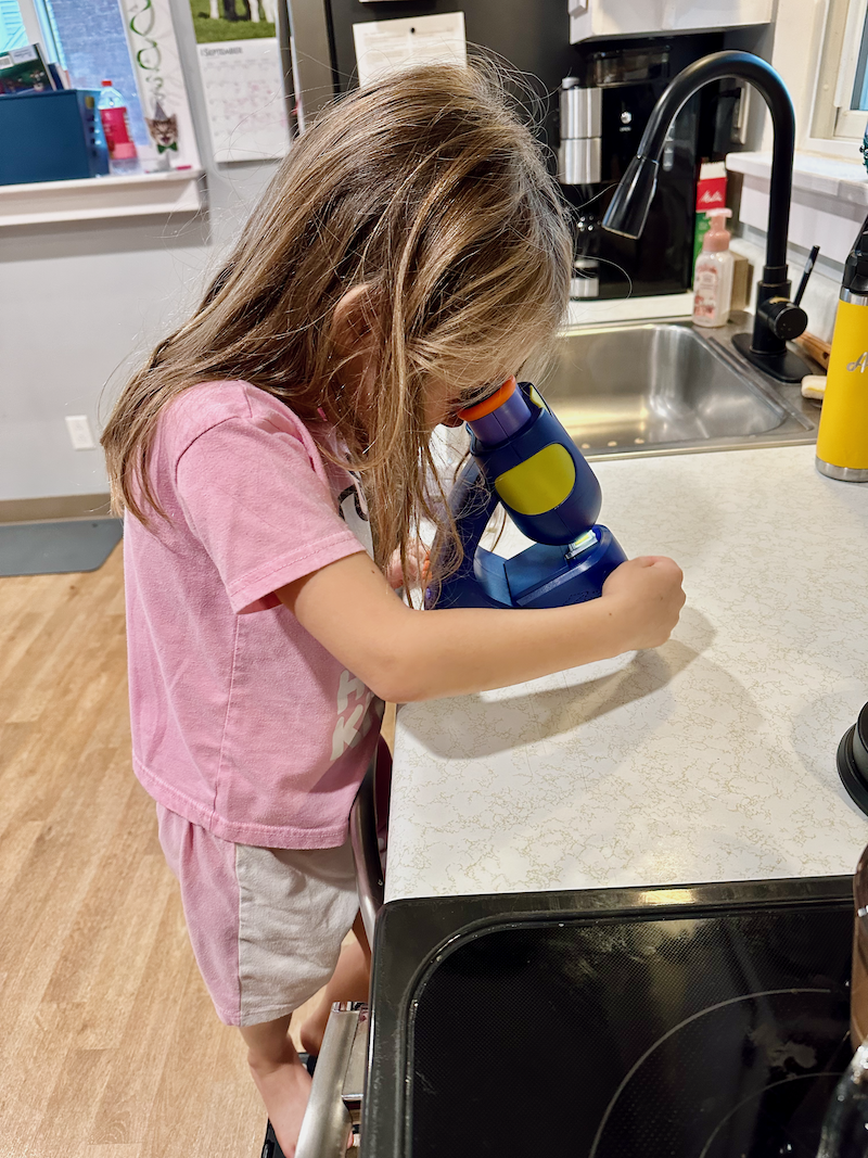 We also had her open her gifts from us! It was so hard not to go crazy and spoil her, but I kept things pretty simple. We had recently been to a new-to-us library that had a microscope and she was glued to that thing the whole time we were there!