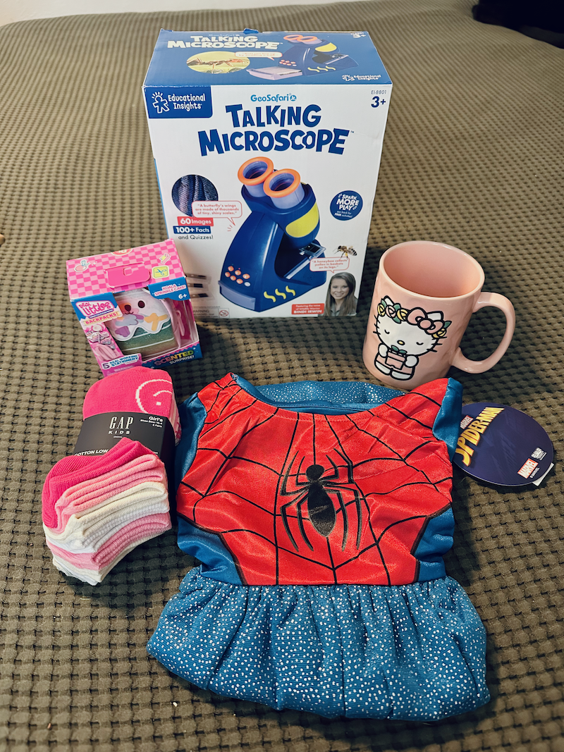 I knew I had to get her a microscope of her own. She also received a new Spiderman nightgown, socks, a mini backpack toy, and Mordecai gave her a Hello Kitty mug for her daily hot cocoa.