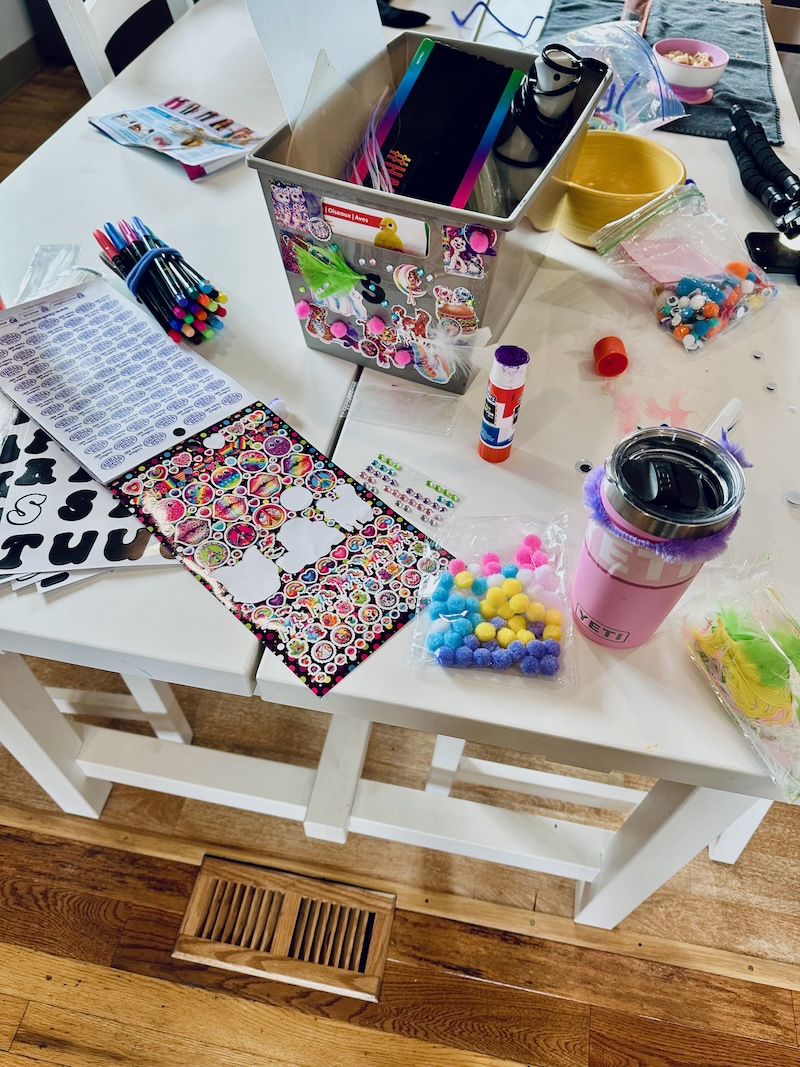 Want to know how I know Sadie is living her best life? If our kitchen table is covered in craft supplies then I know she’s one happy girl. I have a bin of craft supplies I keep up high (basically away from Mordecai, lol) and I pulled it down and the kids had a field day with it.