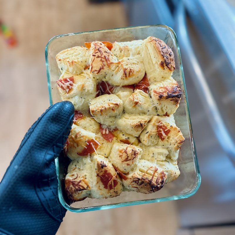 It has the same concept as monkey bread, except it’s savory! Sadie and I cut up a can of biscuits into pieces and coated them in olive oil, Italian seasoning, salt, pepper, parmesan cheese, mozzarella cheese, and sliced pepperoni. We baked it for about 15 minutes and then served it with pizza sauce for dipping!